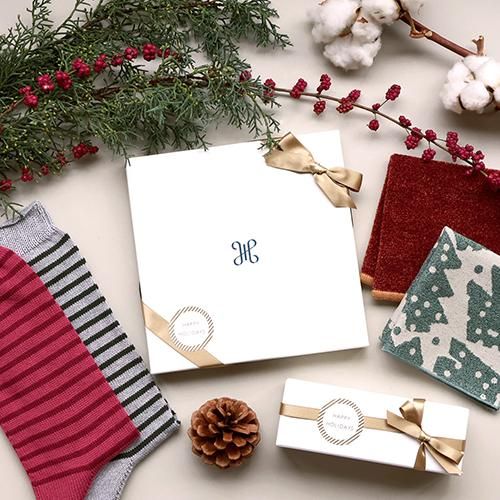 すっきりと美しいギフトボックスは、日本製で頑丈なつくり。エンボス加工の「H」の文字が高級感を演出します。オリジナルデザインの水引は、長野県飯田市で手づくりされています。受け取るひとが心おどるように、包装にも隅々までこだわりました。