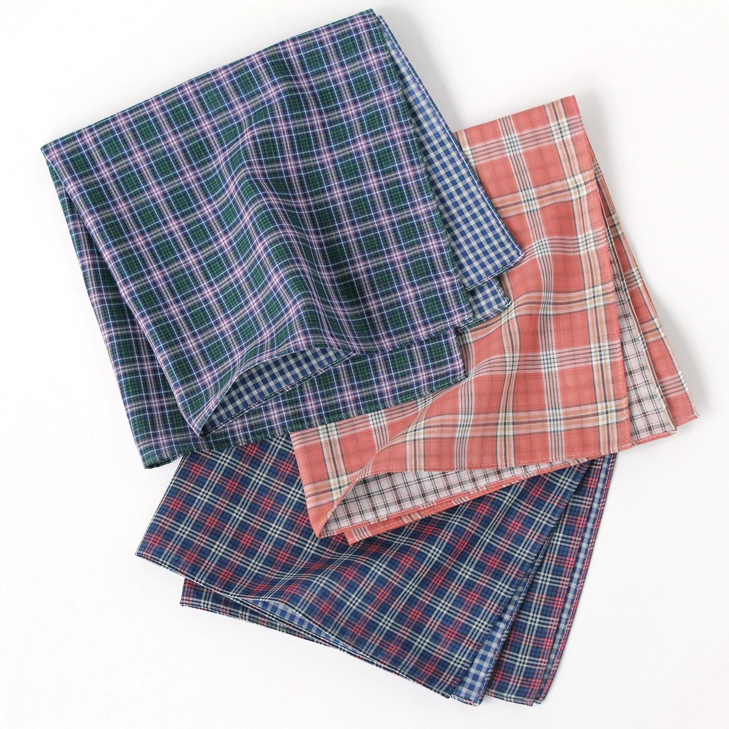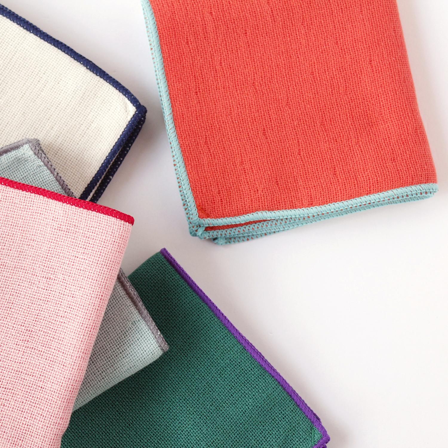 「Wガーゼハンカチ」は2枚のガーゼ生地が重なって織りあがっていく2重の生地をハンカチに仕立てています。ガーゼのなかでも薄手で比較的さらりとした触感。表地と裏地で色や柄が異なり、遊び心が感じられる生地もあります。